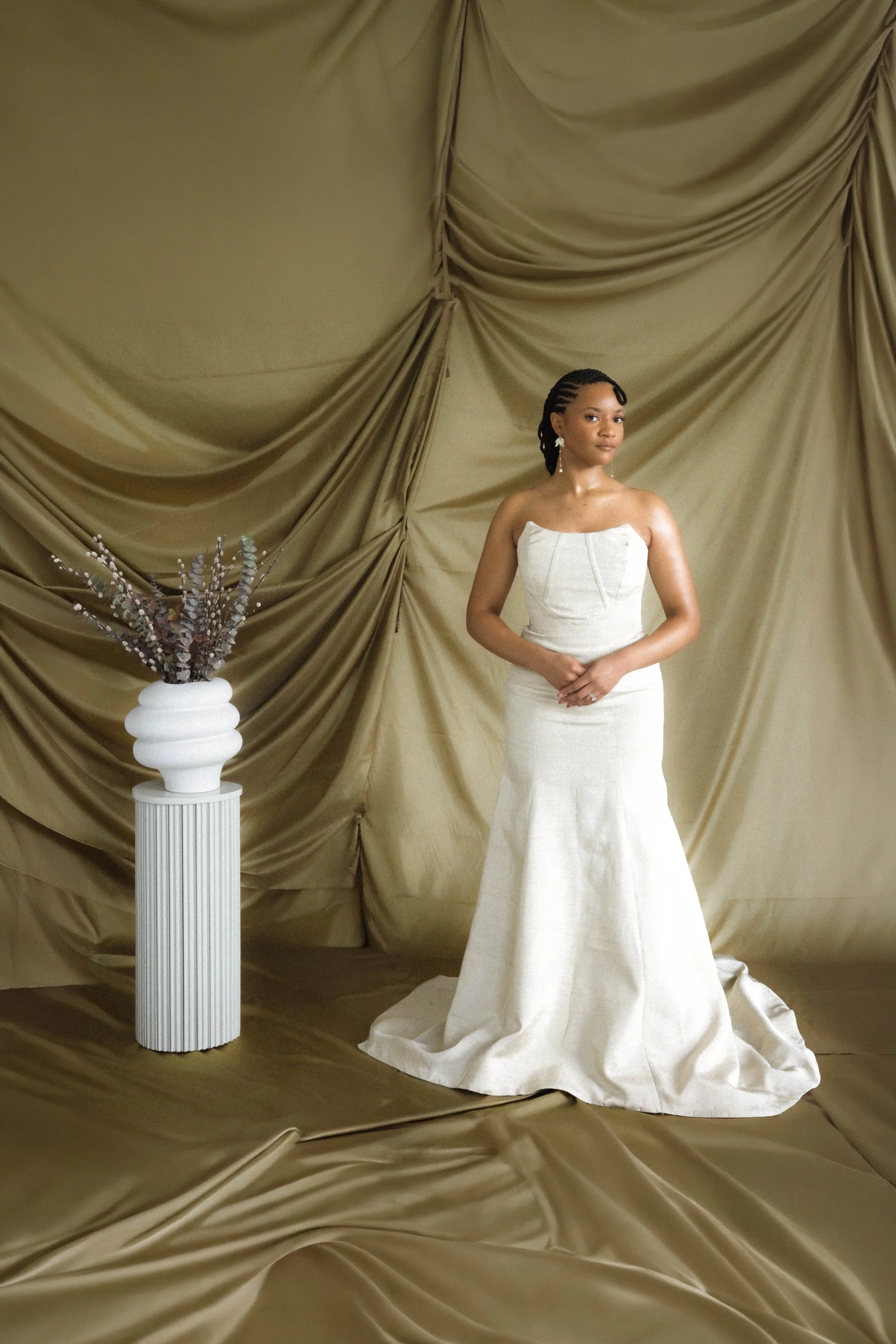 Graceful and intentional, The Noome Dress reimagines the classic English wedding silhouette through a contemporary, cultural lens. Clean in form yet rich in detail, the design reveals its craftsmanship through softly sculpted seams, a structured corset back, and the considered integration of aso-oke — woven with heritage and depth.