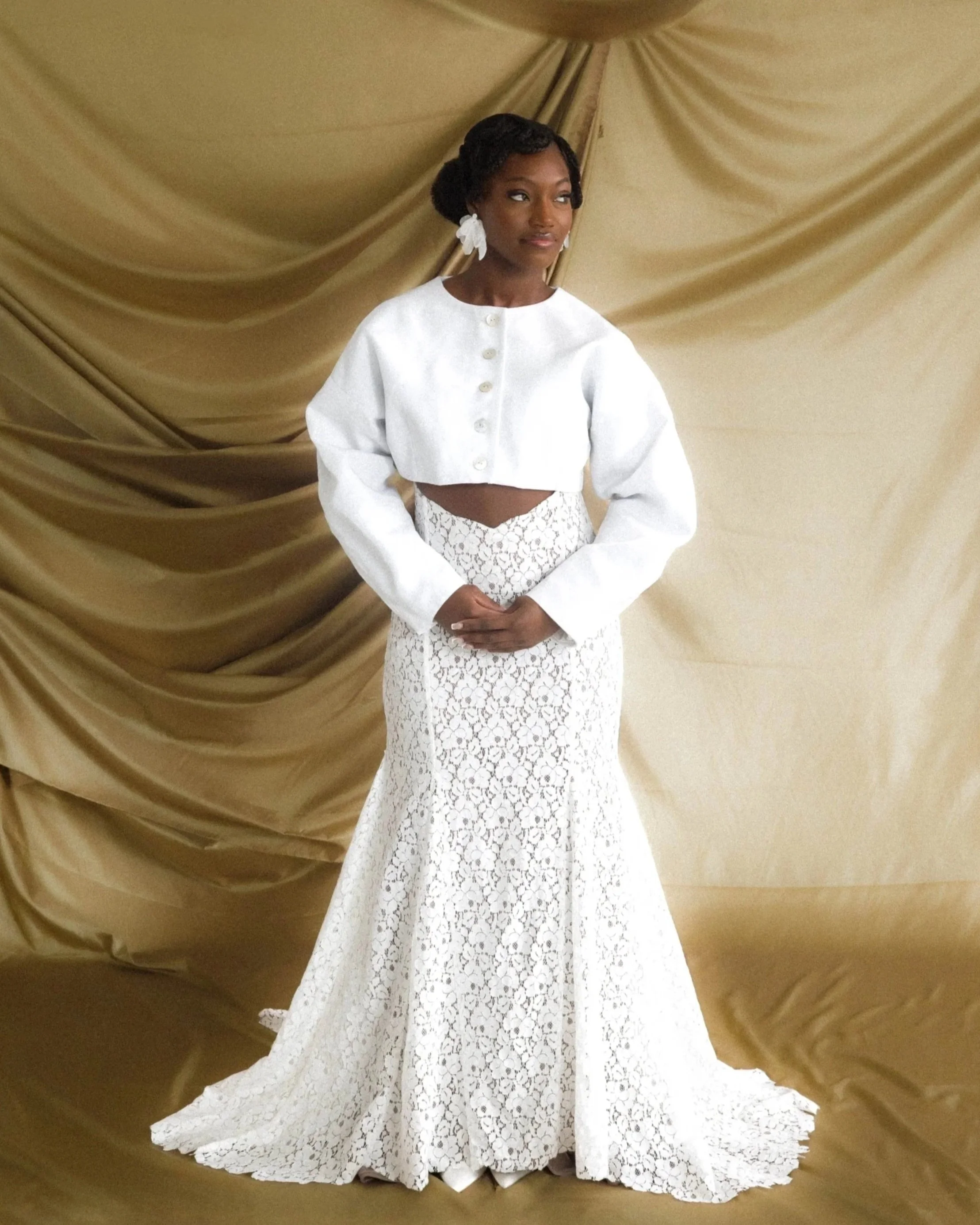 Refined and quietly striking, this bridal look is a modern expression of timeless elegance. A structured cropped jacket brings a sense of poise and intention, its clean lines offering a contemporary contrast to the softness beneath.